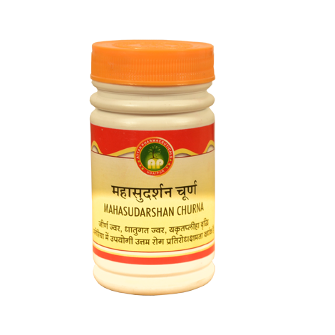 Mahasudarshan Churna is a unique remedy for fever especially of chronic type: associated with diarrhea, indigestion, cough, cold or allergy. It act as antioxidant and helps neutralize viral infections by enhancing immunity & detoxify. It is known to reduce swelling of lymph glands.
